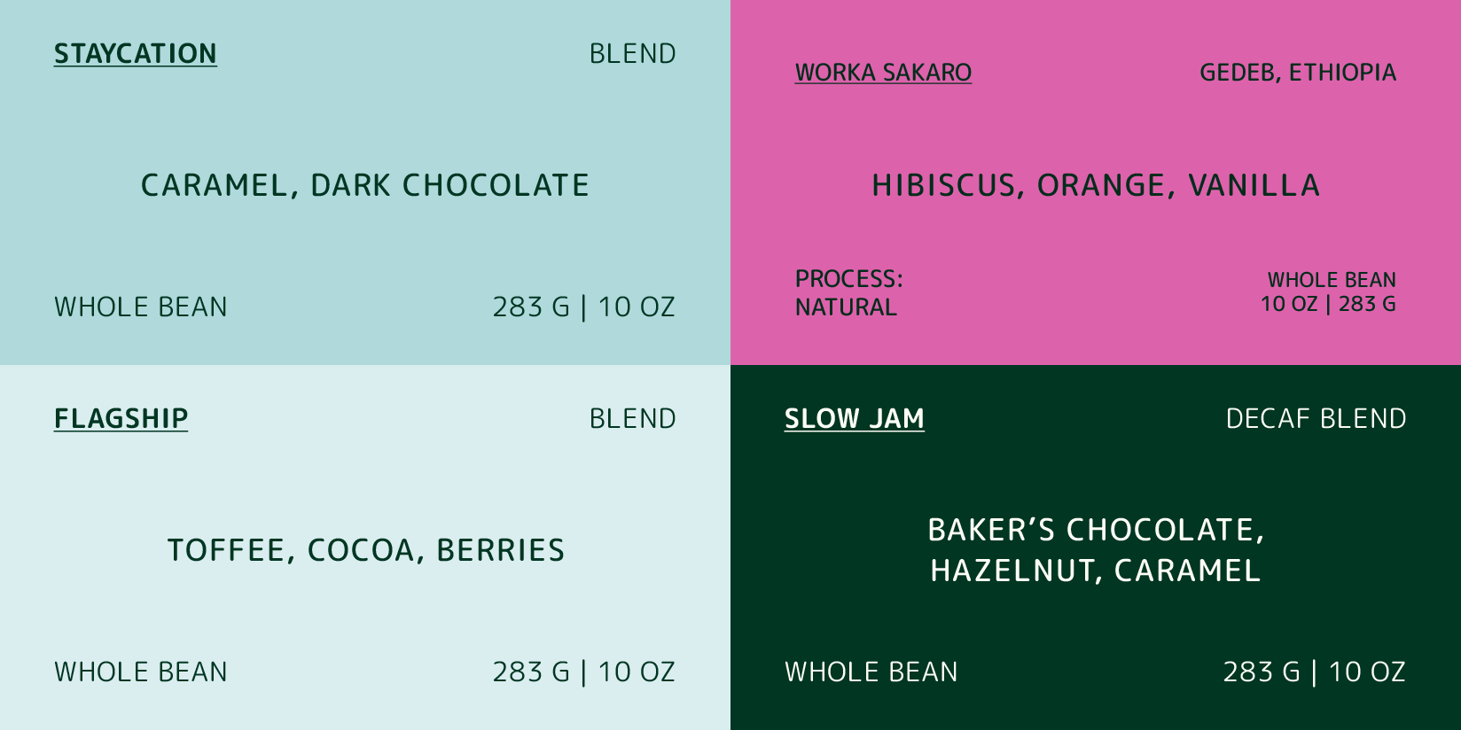 Each sample pack contain 4 4oz bags of 3 our blends and a single origin selected from our current rotation.
